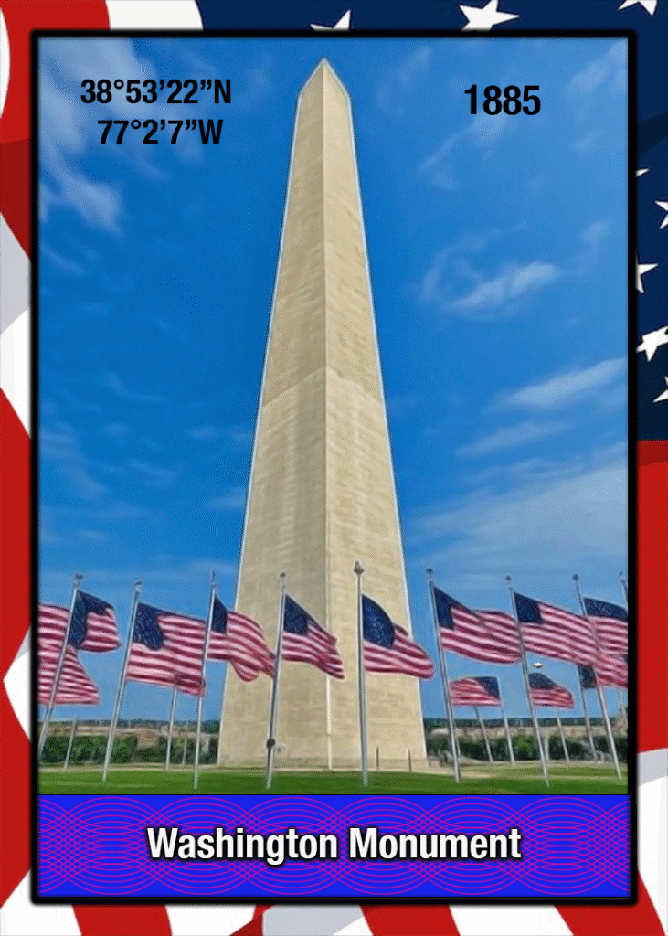 Back: The reverse of the Monuments cards list facts about the monument, at times including its relationship to the use of sacred geometry in the layout of Washington DC. The back of these cards is also where you will find ALL symbols for gameplay.